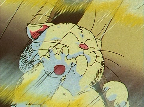 Even Goku's superhuman agility is no match for the cat, as he leads Goku on a chase around and around the tower, matching Goku's Afterimage Technique with his own, eventually becoming bored with the "workout" and calling an end for the day. An exhausted, yet curious Goku asks if anyone has managed to reach the water; the cat responds that the only one who did was Goku's old teacher, Master Roshi, which shocks the boy. He is further shocked when, asking how long it took, Korin responds with three years. The next day, Goku awakes to find Korin dumping "garbage" over the side of the tower, including his Grandpa Gohan's Four-Star Ball. Furious, Goku immediately runs down the tower to retrieve it and climbs it again, while the old cat looks on with satisfaction; what took a day previously has now only taken three hours, a sign of the boy's growing strength.