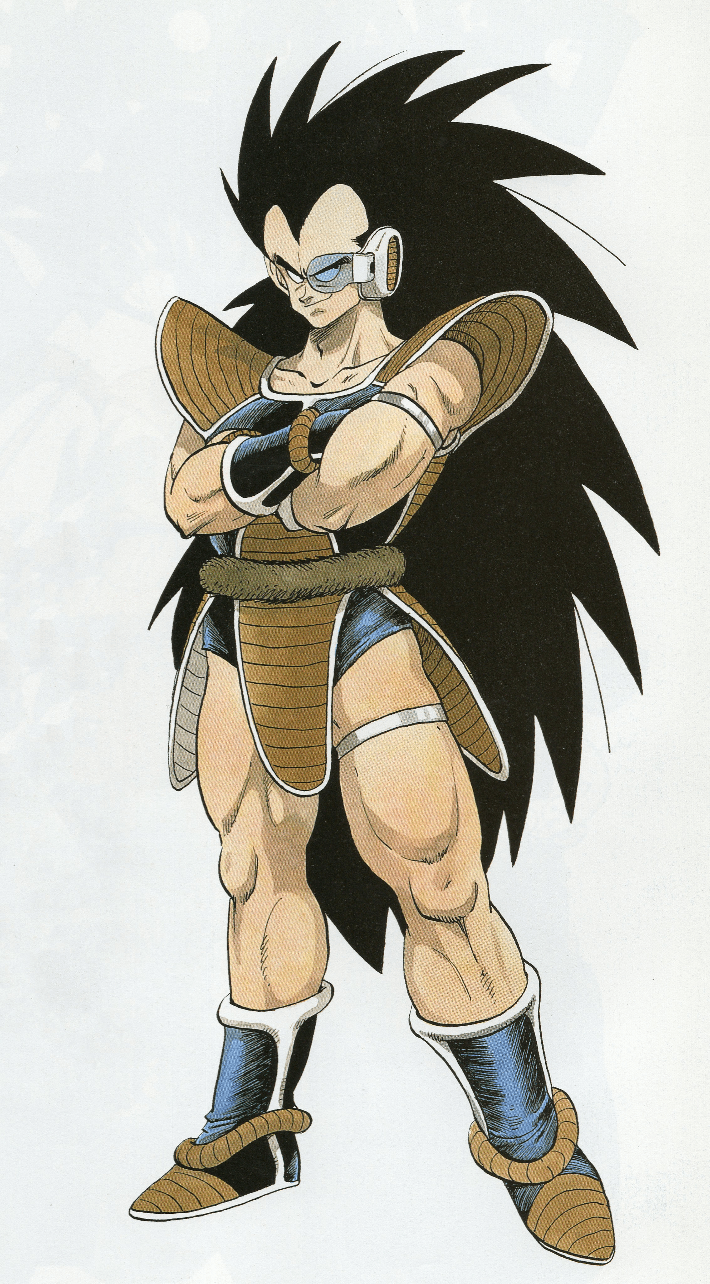 Raditz's appearance consists of extremely long, spiky black hair with a prominent widow's peak, brown and black colored Battle Armor in the same style as the rest of Frieza's soldiers, with boots, armored gloves, and a scouter that is blue in the manga and green in the anime. Additionally, he wears two accessory bands that are white in the manga and red in the anime: one is tightened around his left arm, and the other on his left leg.